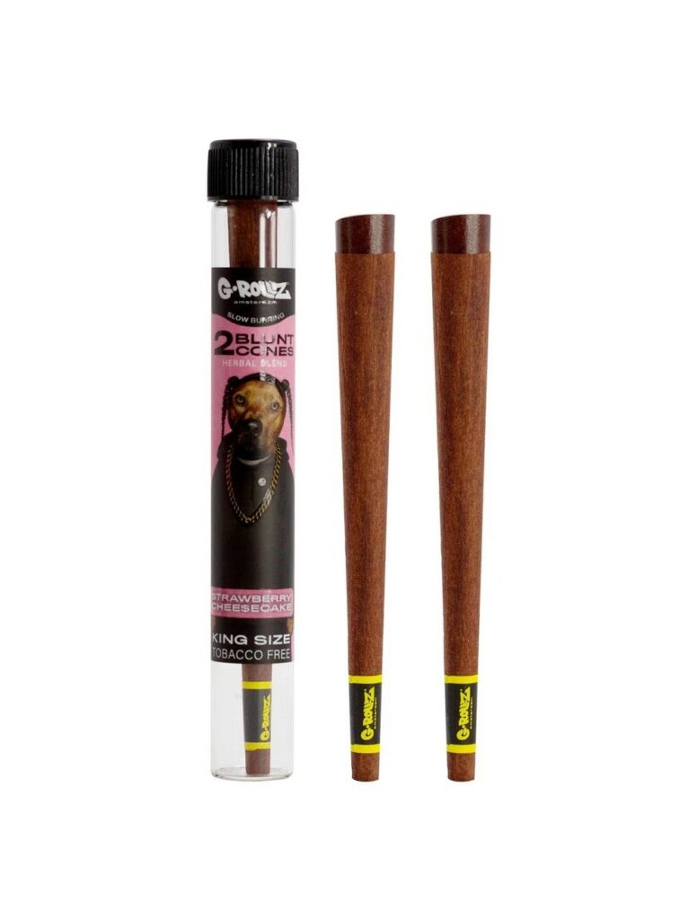 G-Rollz Blunt Cones offer a distinctive smoking experience by combining a blend of chamomile, yerba mate, and a hint of cacao, all infused with bud-derived terpenes. These cones are a tobacco and nicotine-free alternative, providing a flavorful and aromatic smoke. citeturn0search0